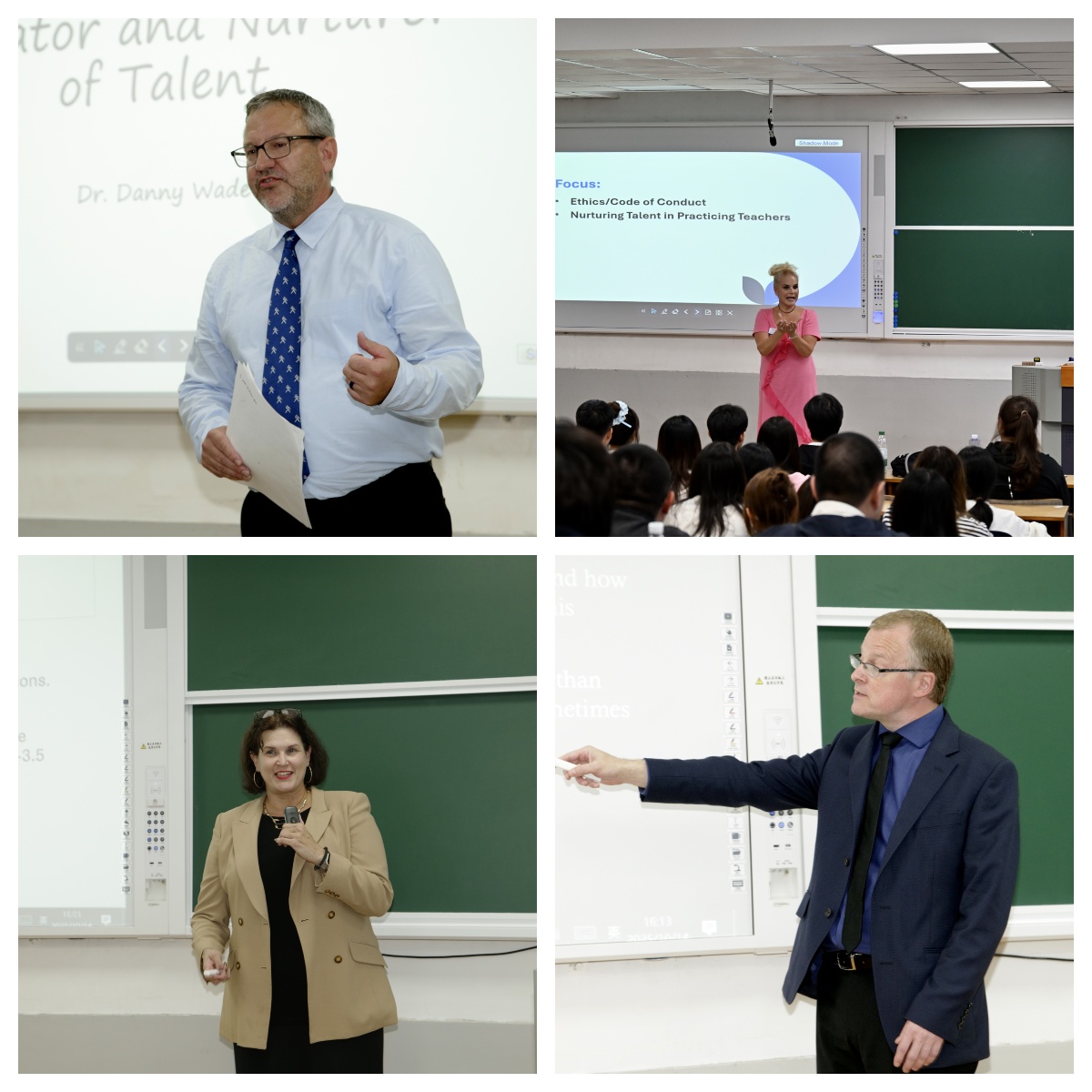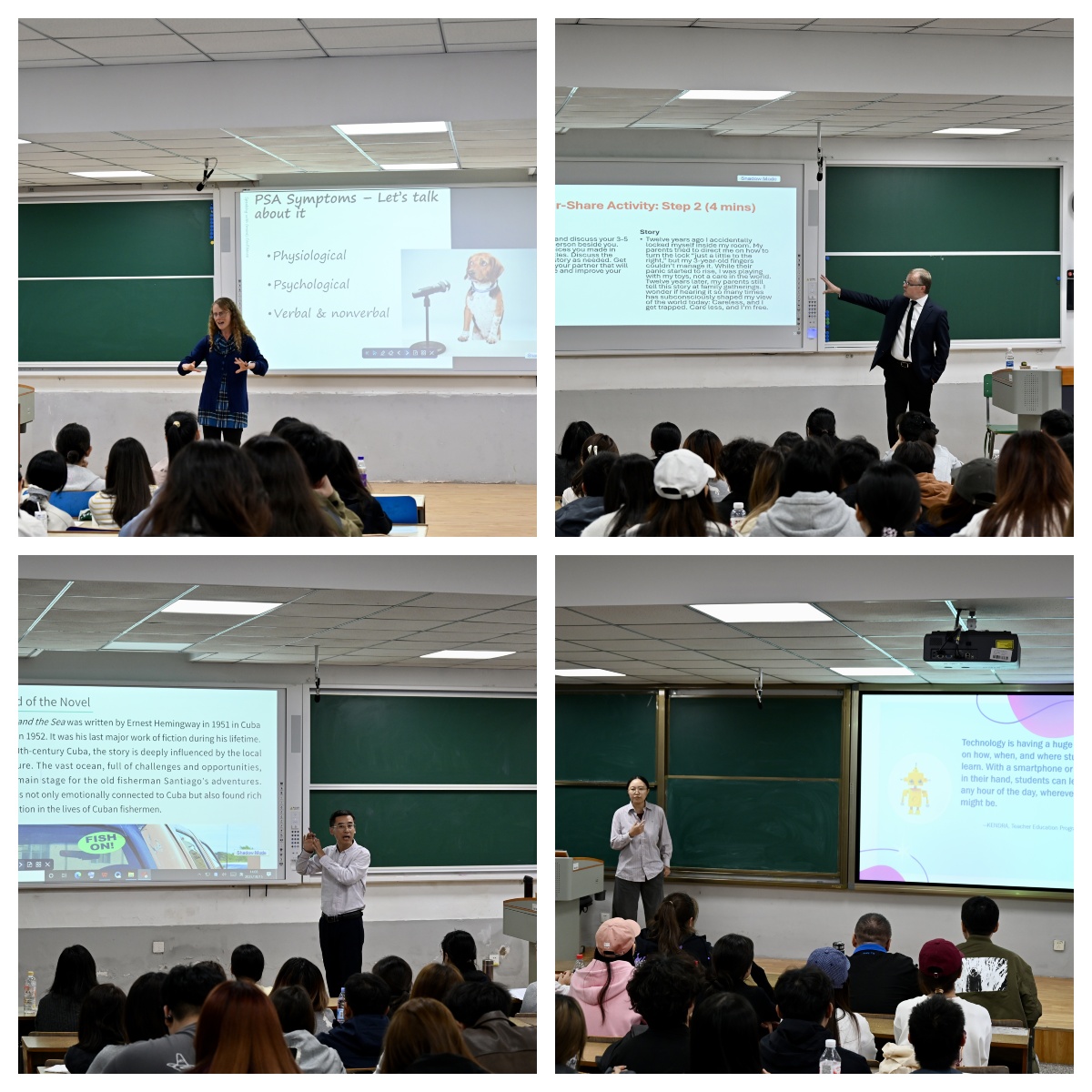 10月14日,代表团专家结合各自的研究领域与教学经验带来多场专题讲座。拥有28年教育经验的Danny Wade博士以“华盛本大学道德教育实践”为主题,解读该校将职业素养融入师范生培养的课程设计与实践活动,分享“可信度、价值、努力、效能感、归属感”五大育人核心信念,为我院师范生培养提供国际借鉴。Tracie Lutz高级讲师带来两场“师德与育才”讲座,首场解读华盛本大学《行为准则》中的七大关键准则,结合《读写能力与评估》课程经验提出“构建师生积极关系”等育人理念;第二场聚焦“带来改变的教学实践”,探讨主动学习设计、形成性评估融入等方法。Melanie Burdick博士以“AI与写作教学”为题,分析AI对写作全流程的重塑作用,兼顾个性化指导、智能批改等技术优势,以及学术诚信、技术与人文平衡等争。Corey Zwikstra博士分享《贝奥武夫》人物塑造研究,提出“诗歌如镜像之屋”观点,引导学生培养文学批判性思维。
