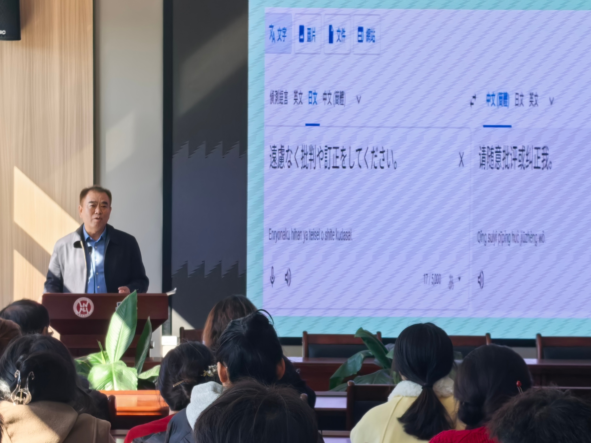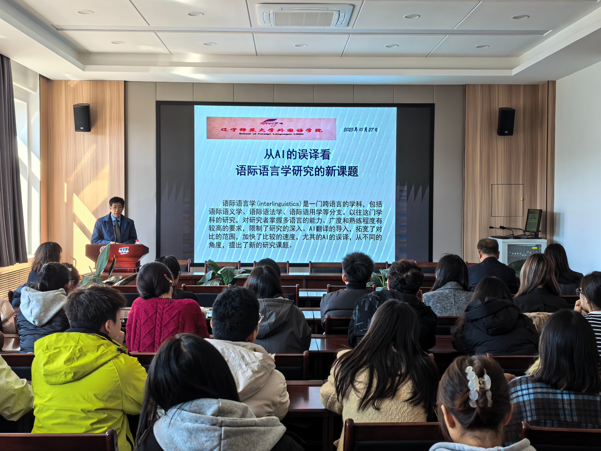 2025年10月27日上午,我院邀请日本北九州市立大学王占华教授以“从AI的误译看语际语言学研究的新课题”为题开展学术讲座。图书馆党总支书记杨春宇教授,外国语学院院长姜晖、副院长范业红、刘丹丹及50余名师生参会聆听。讲座由副院长范业红主持。