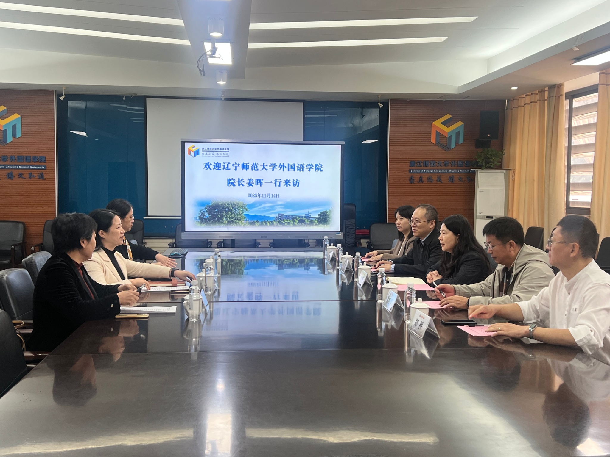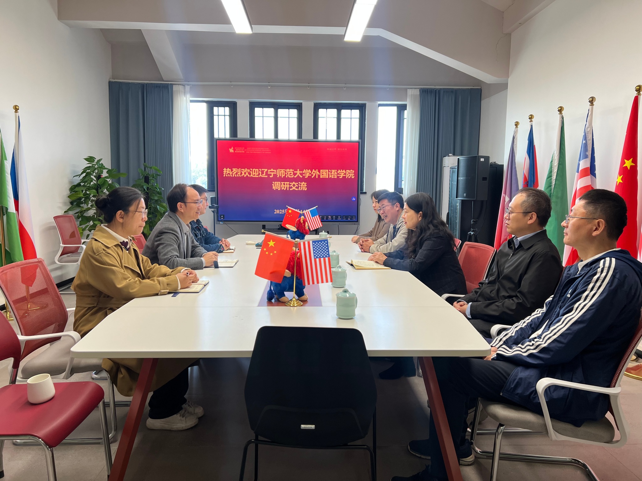 在浙江师范大学调研期间,姜晖院长一行先行走访了浙江师范大学堪萨斯大学联合教育学院。联合教育学院党委书记徐展斌详细介绍了该院在中外合作办学方面的制度设计、运行机制与育人成效。姜晖院长也分享了我院在国际化办学方面的探索与实践。双方就中外合作办学中课程衔接、师资建设、质量保障等关键问题展开深入交流。