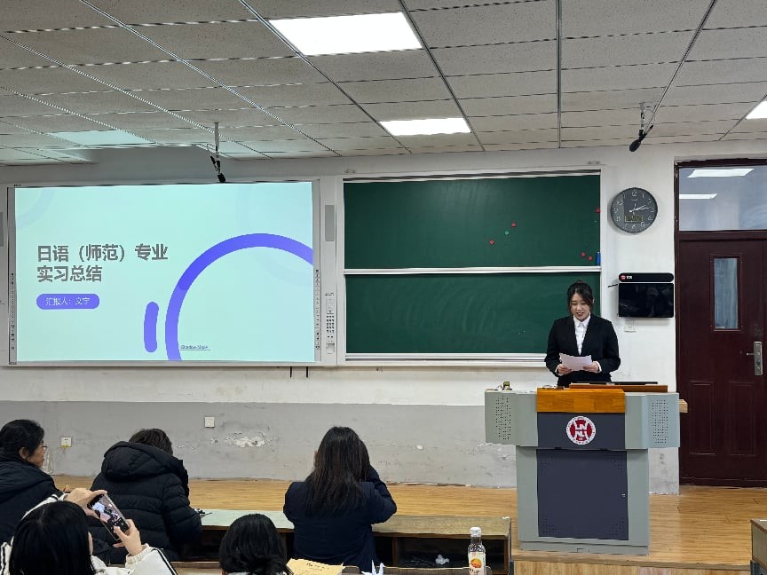 在优秀实习生代表分享环节,英语(师范)专业的闫泓俊和日语(师范)专业的文宇同学先后发言。他们代表全体实习生,向学院领导的精心组织、向校内外指导教师的谆谆教诲表达了最诚挚的感谢。他们结合自身在备课、授课、班级管理及教研活动中的鲜活案例,生动讲述了从“学生”到“准教师”角色转换过程中的挑战、思考与蜕变。他们表示,教育实习让自己深刻体会到“学然后知不足,教然后知困”的真谛,未来将带着这份宝贵的实践收获,坚定教育理想,夯实专业基础,提升育人能力。
