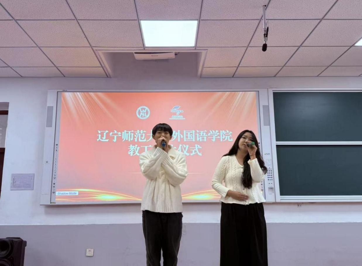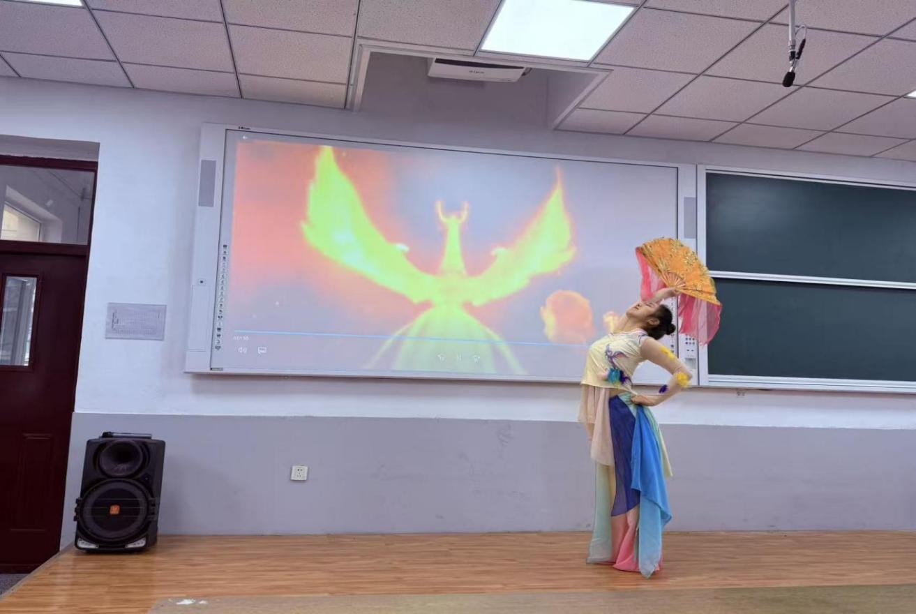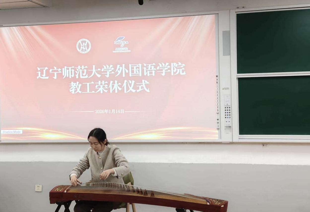 紧接着,青年教师代表刘家宁、马崧译、胡晓玉、丁嘉献上配乐诗朗诵《薪火相传,师道永存》,以铿锵之声、绵长之情,颂扬荣休教工如明灯指引、如春雨润物的崇高师德。随后,俄语系教师刘怡彤表演舞蹈《有凤来仪》,英语系教师刘婉竹弹奏古筝曲《渔舟唱晚》,以优雅舞姿与悠扬乐声,诠释了中外文化交融之美,也寄托了对退休教工美好晚年的祝愿。