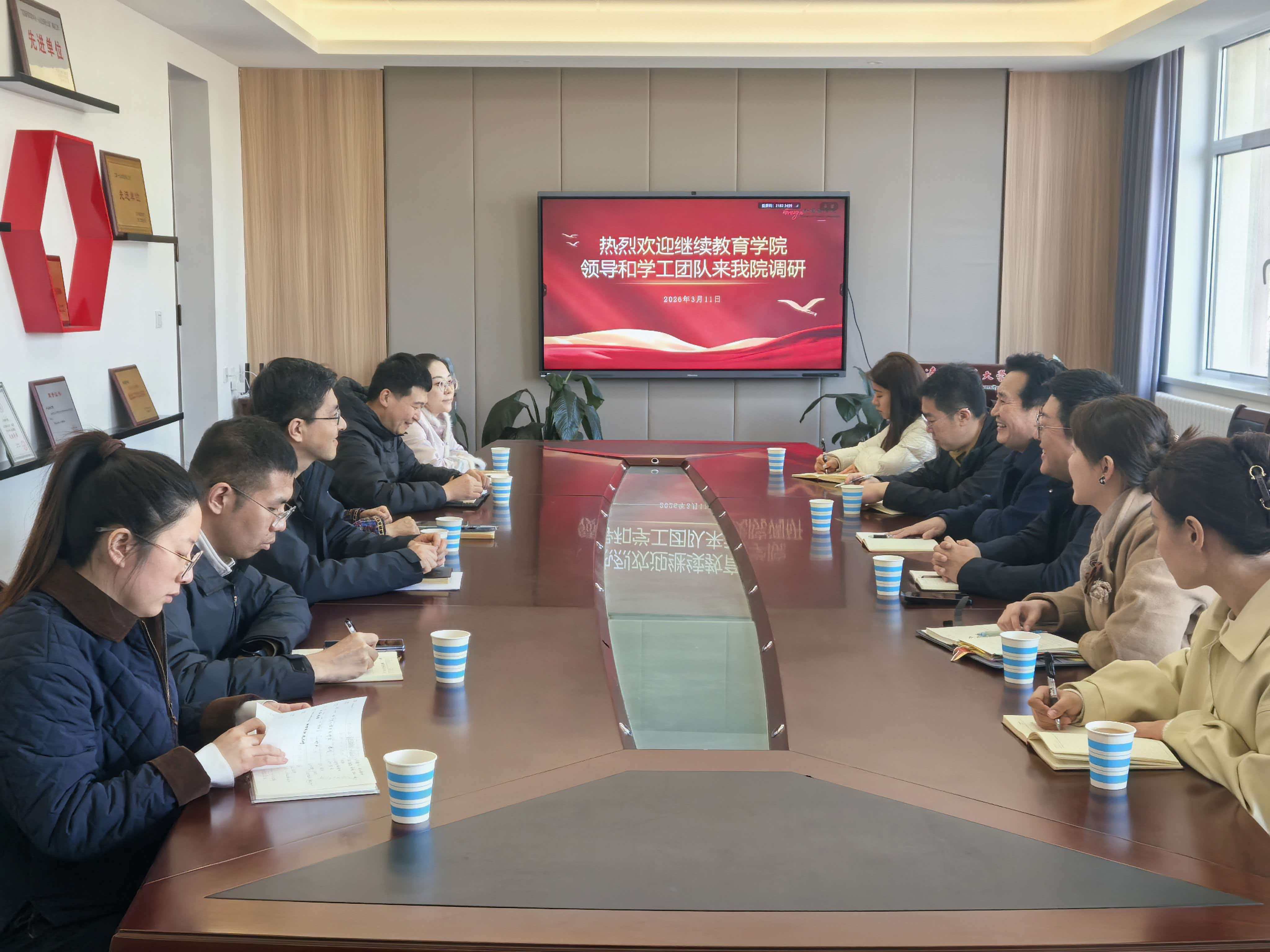 为进一步提升学生工作水平,探索学生管理新思路,2026年3月11日下午,继续教育学院党总支书记安化春带领学生工作队伍来我院开展学生工作专题调研。外国语学院党委书记孙云笑,党委副书记秦宏大,以及辅导室全体辅导员老师热情接待安化春书记一行,双方在会议室进行深入座谈交流。