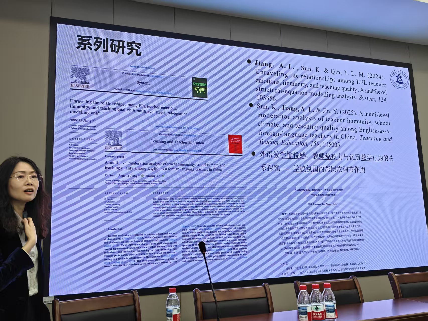 姜莉教授围绕“从情感到效能”这一主线,讲解了她近年来开展的三项关联性研究。研究系统探讨了外语教师情感状态(如愉悦、焦虑等)、教师免疫力与教学质量之间的复杂关系,揭示了学校氛围的跨层次调节作用。姜老师强调,构建“情感滋养”与“系统防护”并重的双元教师发展支持体系十分重要,提倡通过积极的心理学干预与系统性环境重构,赋能外语教师实现可持续发展,最终推动教育质量的整体提升。